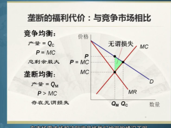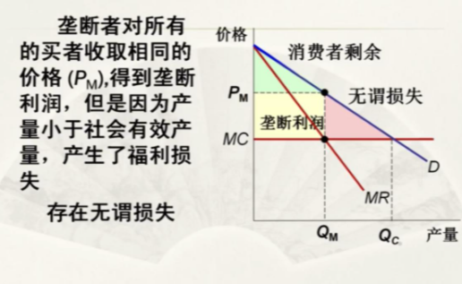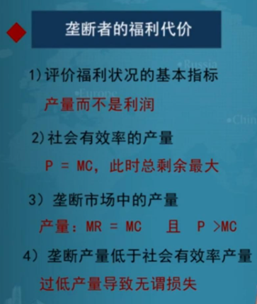 - 垄断市场的福利代价,没生产到社会需求量都是无谓损失。垄断市场会降低社会福利,增加消费者成本。因此政府会干预。