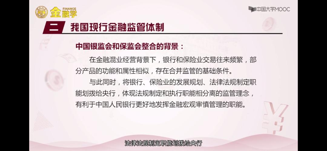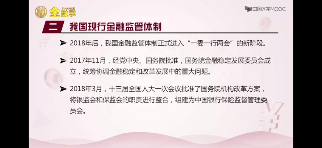 - 我国现行的金融监管制度,有助于货币政策,宏观审慎政策、金融监管之间的协调。减少出现”交叉区域“、”真空区域“的违规套利现象;防止重复监管和监管过度;增强了监管的效力;有助于守住不发生系统性金融风险的底线;维护国家金融安全。