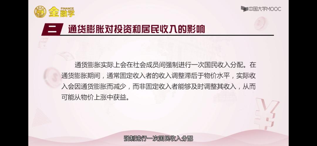 - 通货膨胀对投资和居民收入的影响:通货膨胀实际上会在社会成员间强制进行一次国民收入分配。在通货膨胀期间,通常固定收入者的收入调整滞后于物价水平,实际收入会因为通货膨胀而减少,而非固定收入者能够及时调整其收入,从而可能从物价上涨中获益。