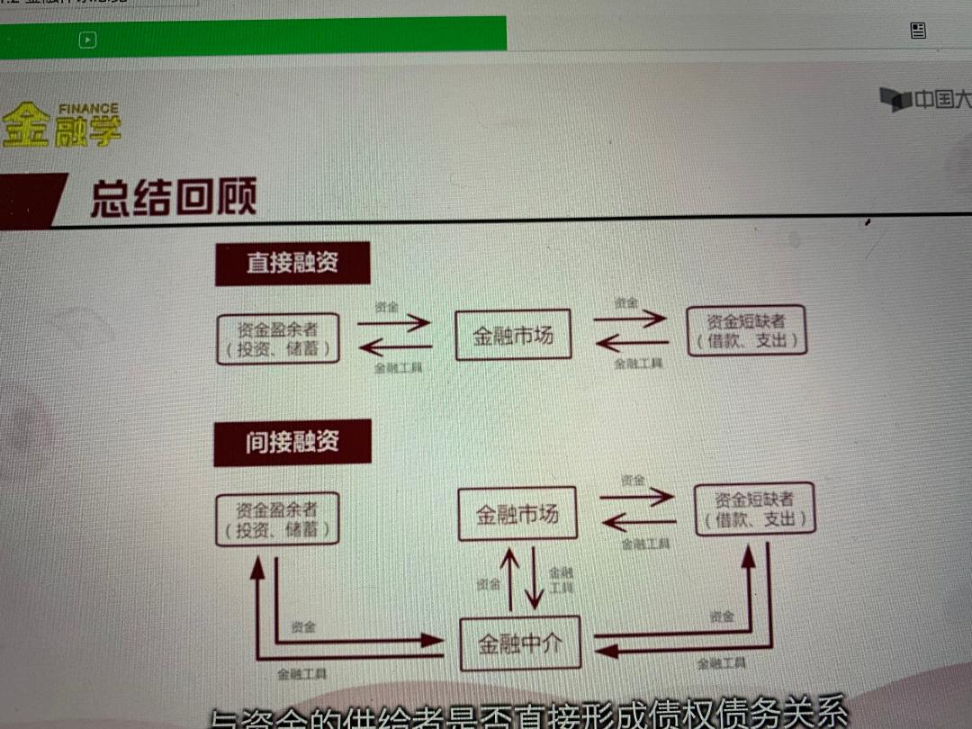 - 直接融资/间接融资:与资金供给者是否直接行为债券债权关系。