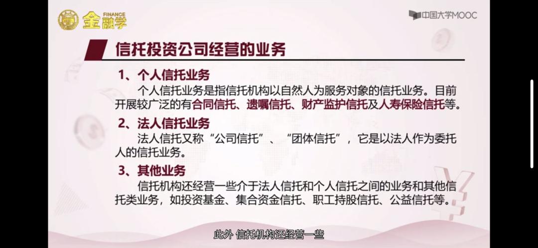- 信托投资公司经营的业务:个人信托业务、法人信托业务、其他业务。