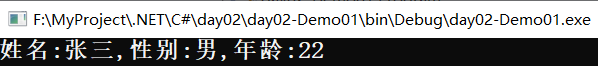 string name = "张三"; char sex = '男'; int age = 22; Console.WriteLine("姓名:{0},性别:{1},年龄:{2}",name,sex,age); Console.ReadKey();
