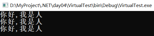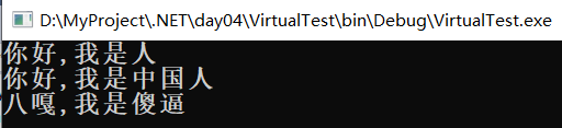 namespace VirtualTest { class Program { static void Main(string[] args) { Person person = new Person(); Chinese chinese = new Chinese(); Japanese japanese = new Japanese(); Person[] persons = { person , chinese , japanese }; foreach ( var item in persons ) { item.sayHello(); } Console.ReadKey(); } } class Person { public virtual void sayHello() { Console.WriteLine("你好,我是人"); } } class Chinese:Person { public override void sayHello() { Console.WriteLine("你好,我是中国人"); } } class Japanese:Person { public override void sayHello() { Console.WriteLine("八嘎,我是傻逼"); } } }