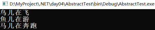 namespace AbstractTest { class Program { static void Main(string[] args) { Bird bird = new Bird(); Fish fish = new Fish(); Horse horse = new Horse(); Animal[] animals = { bird, fish, horse }; foreach ( var item in animals ) { item.move(); } Console.ReadKey(); } } abstract class Animal { public abstract void move(); } class Bird : Animal { public override void move() { Console.WriteLine("鸟儿在飞"); } } class Fish : Animal { public override void move() { Console.WriteLine("鱼儿在游"); } } class Horse : Animal { public override void move() { Console.WriteLine("马儿在奔跑"); } } }