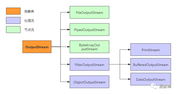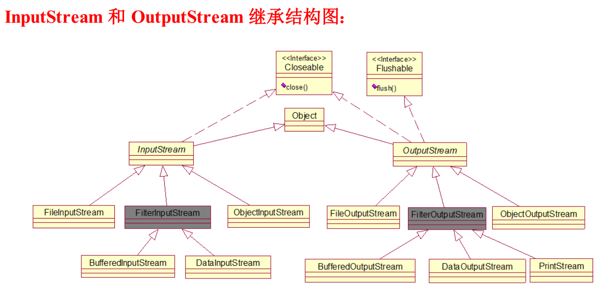 InputStream与OutputStream是两个抽象类,是字节流的基类,所有具体的字节流实现类都是分别继承了这两个类。