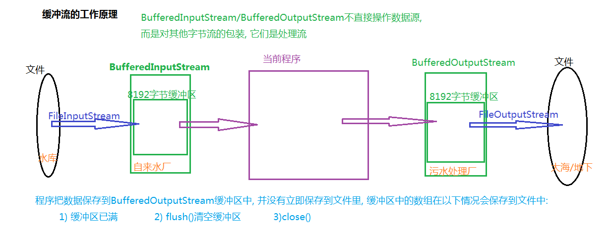 「处理流」:对一个已存在的流的链接和封装,通过对数据进行处理为程序提供功能强大、灵活的读写功能,例如BufferedInputStream(缓冲字节流)