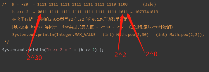 所以这里 b>>>2 等同于 int类型的最大值 - 2^30 - 2^2 (二进制是从2^0开始的)