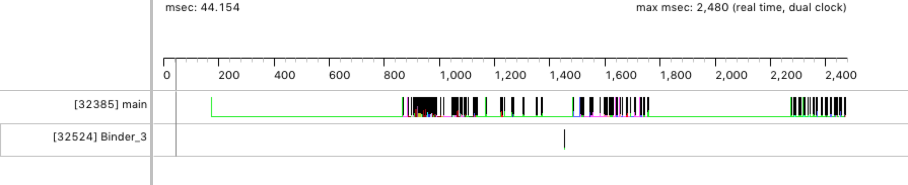 上图就是Timeline面板,左边就是每行都是显示一个线程,右边对应它的时间线。可以看出来主要就是main线程在做事情。
