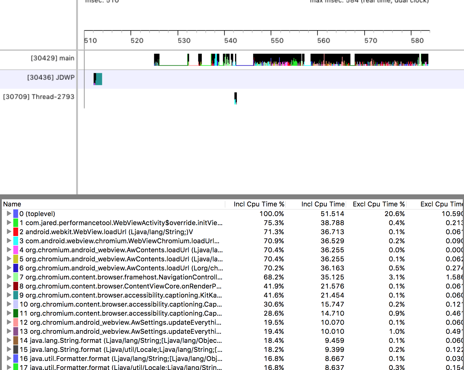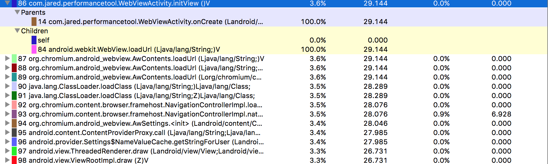 上图就是Profile面板,首先是左边的name,比如序号为86,这里展开有Parents和Children,其中Parents就是调用该方法的方法,这里initView在onCreate中被调用,Children就是该方法内部调用的方法,这里调用了loadUrl。与项目中的真实的代码完全相符。