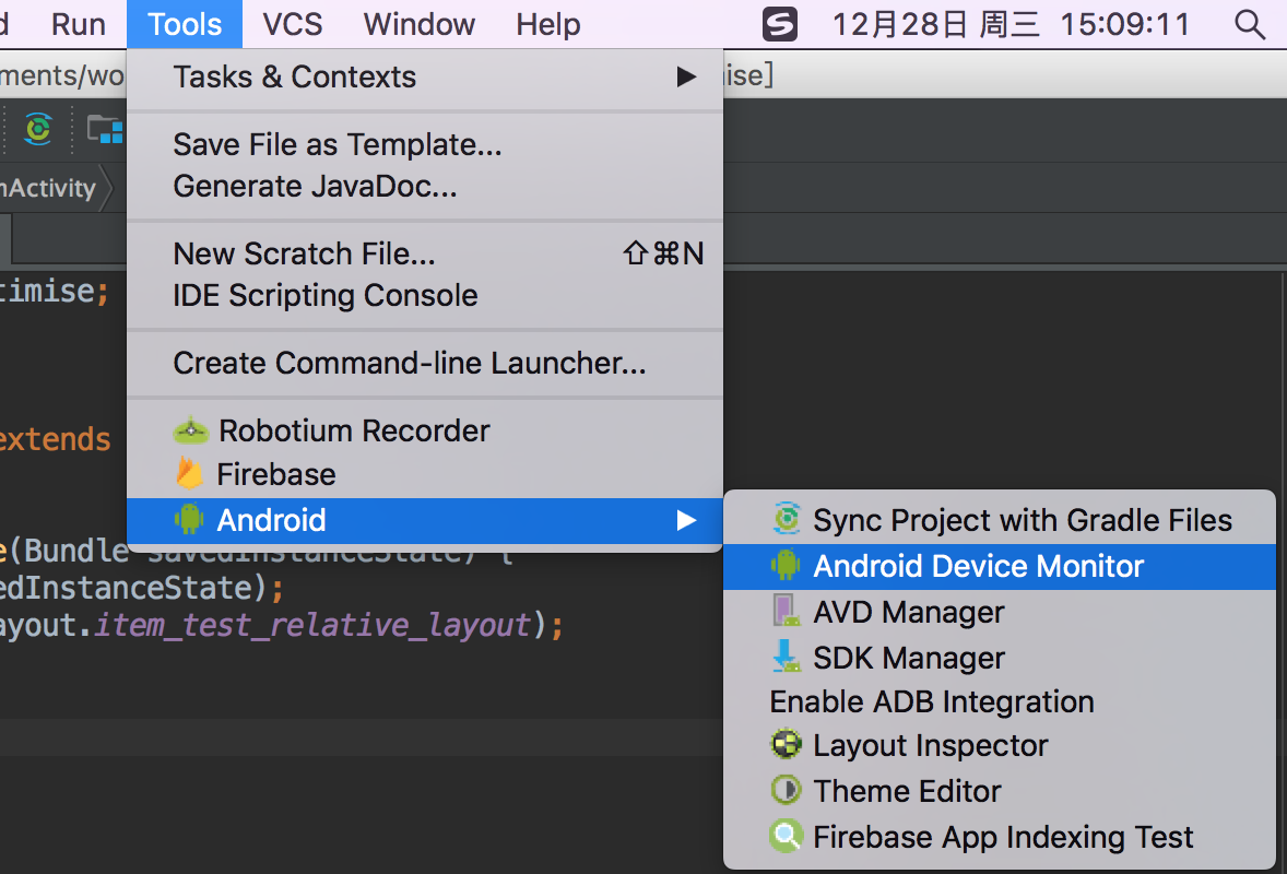 接着运行程序,成功运行后,点击菜单栏的Tools -> Android -> Android Device Monitor :