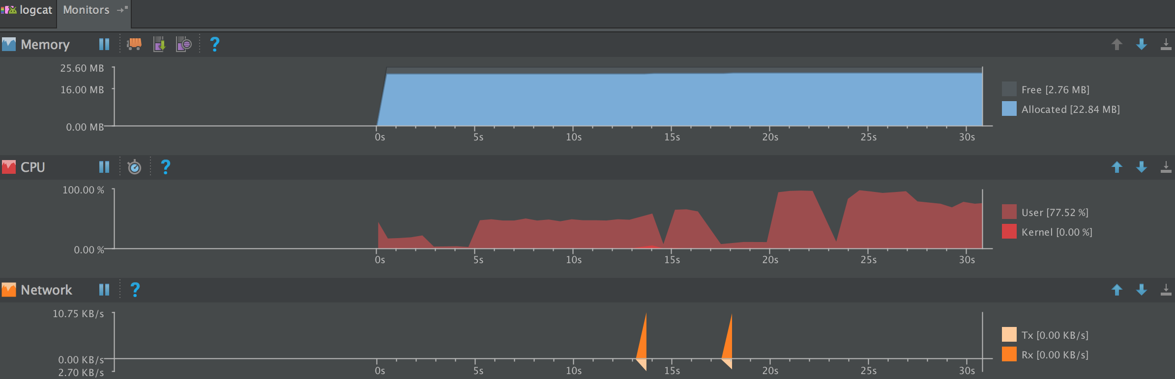 Android Studio的Android Monitor里面有logcat和Monitors,选中monitors就有对于Memory,CPU和Network的展示。如下图所示: