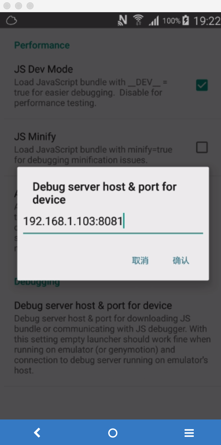 因为iOS用的是模拟器,所以不需要改ip地址了,直接使用localhost了,接着就是andoird了,因为用的真机,所以这里修改下ip地址如下图: