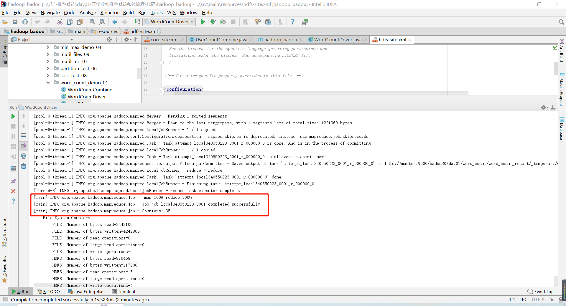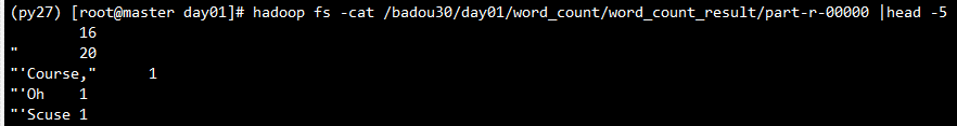 (py27) [root@master day01]# hadoop fs -cat /badou30/day01/word_count/word_count_result/part-r-00000 |head -5