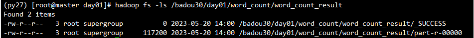 (py27) [root@master day01]# hadoop fs -ls /badou30/day01/word_count/word_count_result