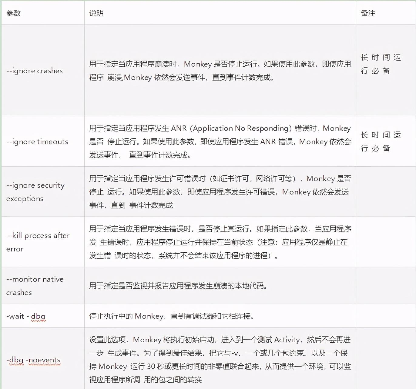 以下命令主要用于控制在 monkey 命令执行过程中的一些调试选项。 其中 --ignore-crashes 和 --ignoretimeouts 在长时间运行(比如下班后运行几个小时),可以保证在运行过程