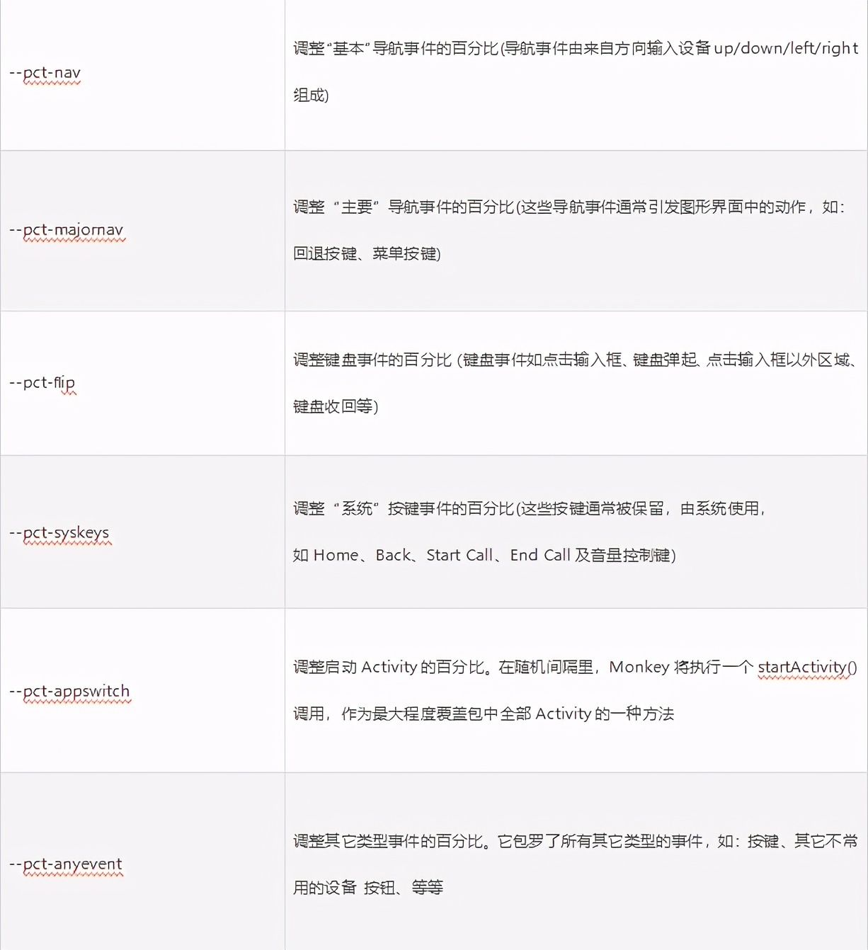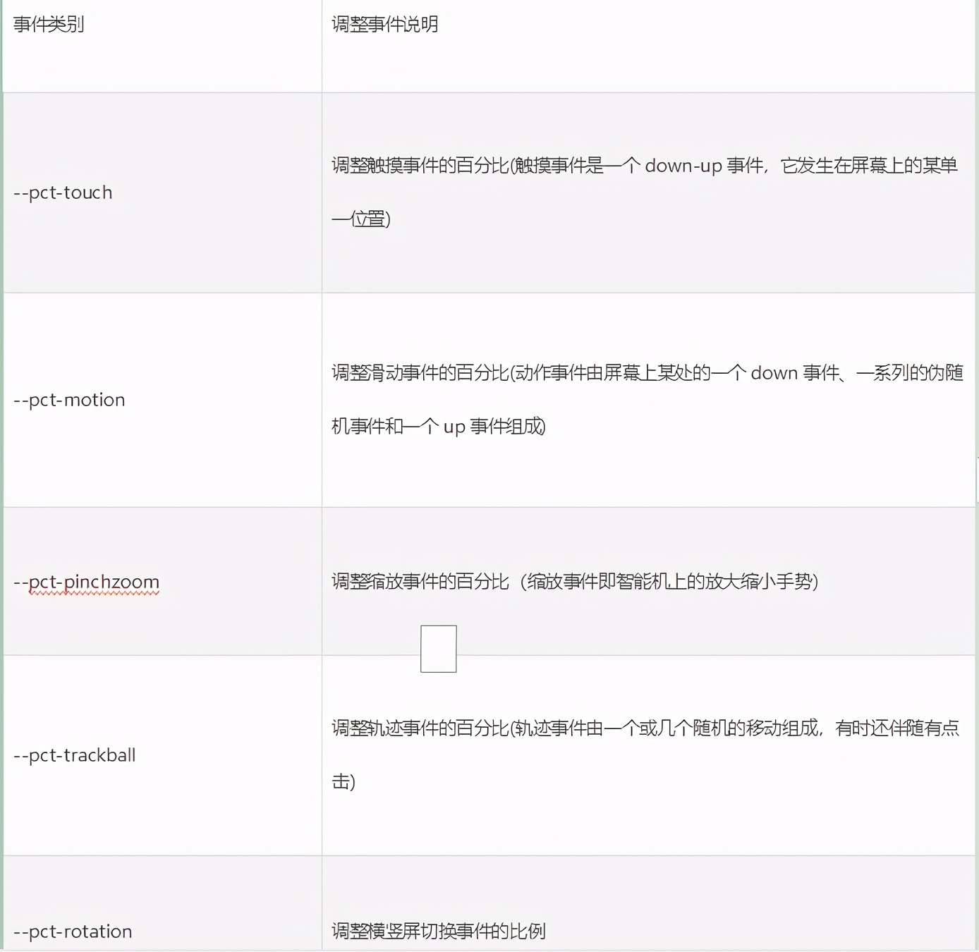 monkey 随机发送的命令中包含各种随机事件,各种类型的事件按照某种比例产生。如果想要指定某种类型的事件 更多一些可以指定该事件的百分比。