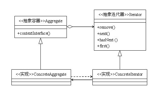 迭代器模式是与集合共生共死的,一般来说,我们只要实现一个集合,就需要同时提供这个集合的迭代器,就像java中的Collection,List、Set、Map等,这些集合都有自己的迭代器。假如我们要实现一个这样的新的容器,当然也需要引入迭代器模式,给我们的容器实现一个迭代器。