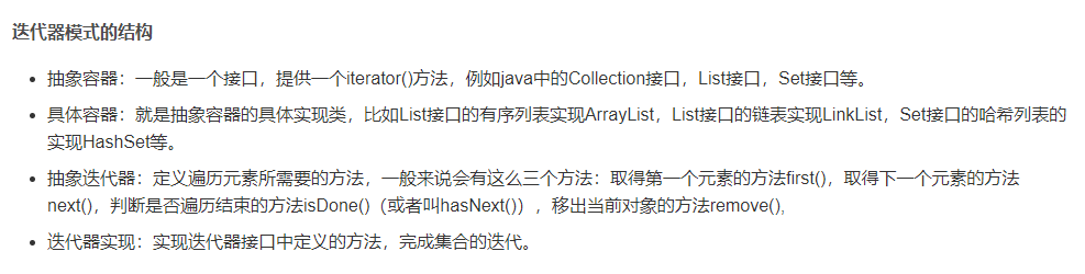 但是,由于容器与迭代器的关系太密切了,所以大多数语言在实现容器的时候都给提供了迭代器,并且这些语言提供的容器和迭代器在绝大多数情况下就可以满足我们的需要,所以现在需要我们自己去实践迭代器模式的场景还是比较少见的,我们只需要使用语言中已有的容器和迭代器就可以了。