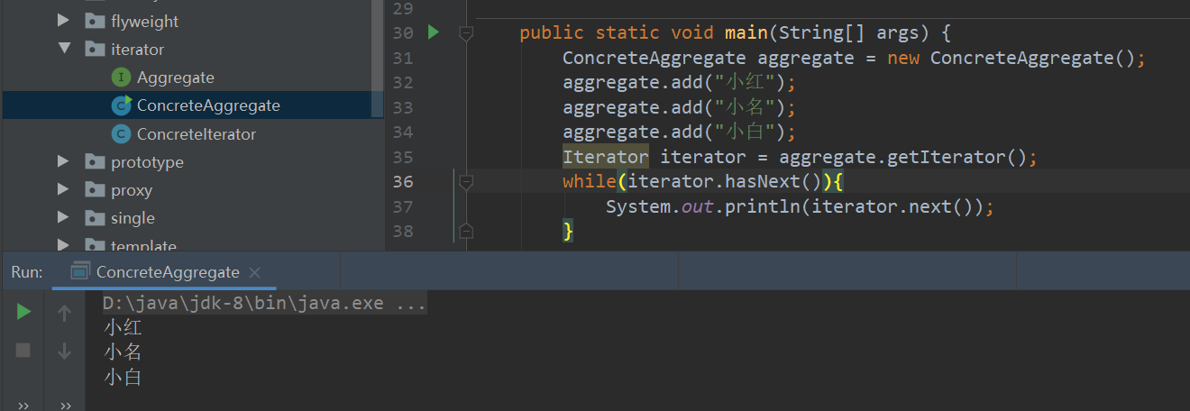 /** * @author wuyimin * @create 2021-07-28 18:02 * @description 容器类 */ public class ConcreteAggregate implements Aggregate { private List list=new ArrayList<>(); @Override public void add(Object o) { list.add(o); } @Override public void remove(Object o) { list.remove(o); } @Override public Iterator getIterator() { //传入数组到迭代器中 return new ConcreteIterator(list); } public static void main(String[] args) { ConcreteAggregate aggregate = new ConcreteAggregate(); aggregate.add("小红"); aggregate.add("小名"); aggregate.add("小白"); Iterator iterator = aggregate.getIterator(); while(iterator.hasNext()){ System.out.println(iterator.next()); } } }