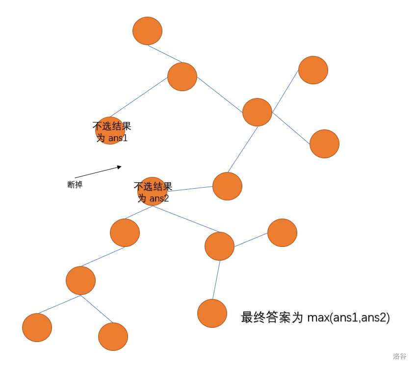 然后图就转换成了一棵树。后面基本上就对标 没有上司的舞会了,我们设断开的边连接着的两个端点为 \(ux,uy\) ,分别以 \(ux\) 和 \(uy\) 跑一遍树形 dp。我们可以设状态 \(dp_{i,0/1}\) 表示以结点 \(i\) 选(1)或不选(0)的最大利润(只算一个点的祖先有点 \(i\) 的情况),那么根据题目要求 \(dp_{u,1} = \sum dp_{v,0}\) (\(u\) 为 \(v\) 的父亲),因为选点不能相邻;而 \(dp_{u,0} = \sum \max(dp_{v,0},dp_{v,1})\)。先求儿子,再求父亲,答案就为根节点不选时的答案。