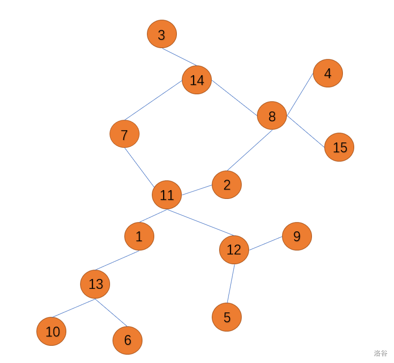 我们一边记录访问一边记录父亲。假设访问的顺序是这样的:\(1\to13\to10\to6\to11\to2\to8\to4\to14\to3\to7\)