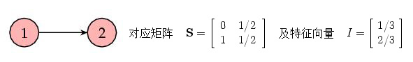 对目前的方法而言,上述三个的答案都是否定的!下面,我们将看看如何改进我们的方法,使得改进后的算法满足上述三个要求。先看个非常简单的例子。考虑如下包含两个网页的小网络,其中一个链接到另一个: