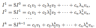 当j≥2时,因为所有特征值的绝对值小于1,因此这是λkj→0。从而Ik→I=c1v1,后者是对应于特征值1的一个特征向量。需要指出的是,Ik→I的速度由|λ2|确定。当|λ2|比较接近于0时,那么λk2→0会相当快。例如,考虑下述矩阵