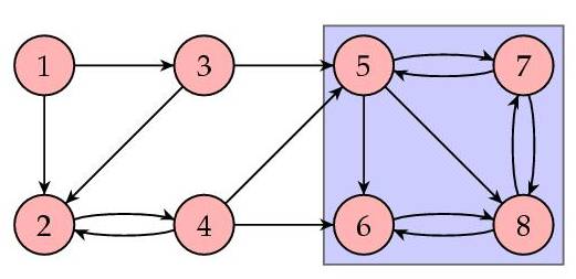 注意到前四个网页的网页排序值均为0。这使我们感觉不太对:每个页面都有其它网页链接到它,显然总有人喜欢这些网页!一般来说,我们希望所有网页的重要性排序值均为正。这个例子的问题在于,它包含了一个小网络,即下图中蓝色方框部分。