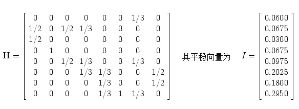 换言之,向量I是矩阵H对应特征值1的特征向量。我们也称之为矩阵H的平稳向量(stationary vector)。