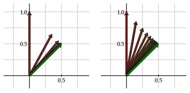 这个矩阵的特征值为λ1=1及λ2=0.3。下图左可以看出用红色标记的向量Ik收敛到用绿色标记的平稳向量I。