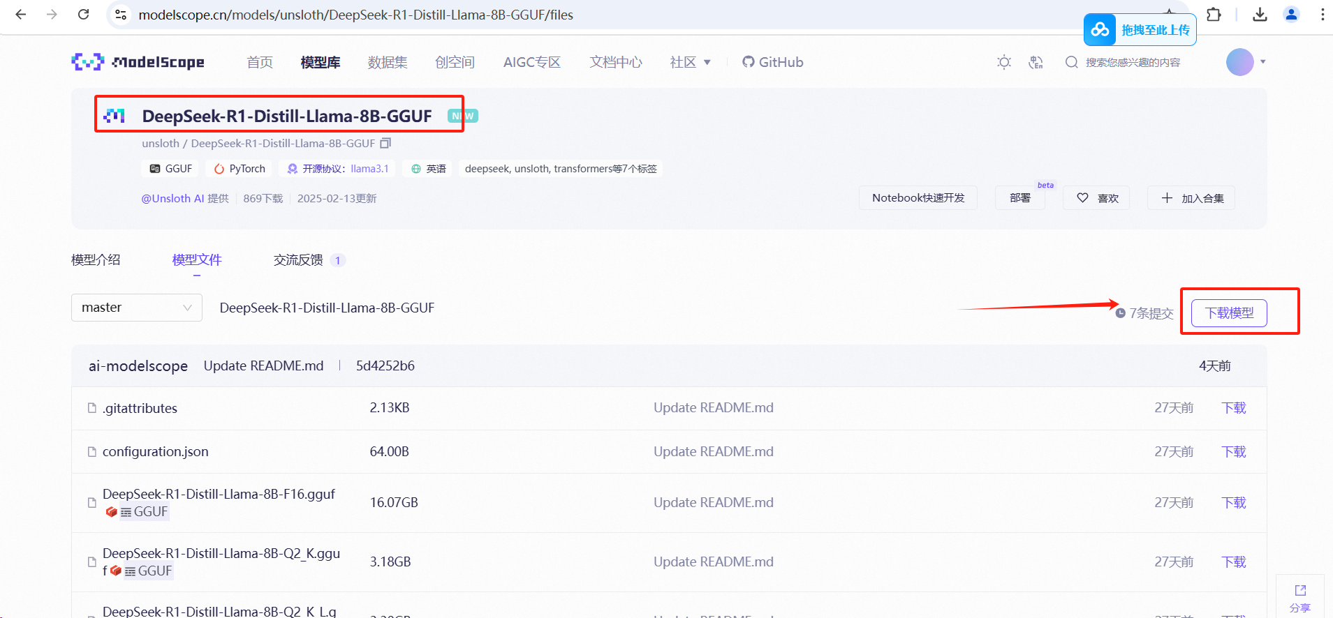 1.进入modelscope官网下载.gguf文件:https://www.modelscope.cn/models/unsloth/DeepSeek-R1-Distill-Qwen-7B-GGUF