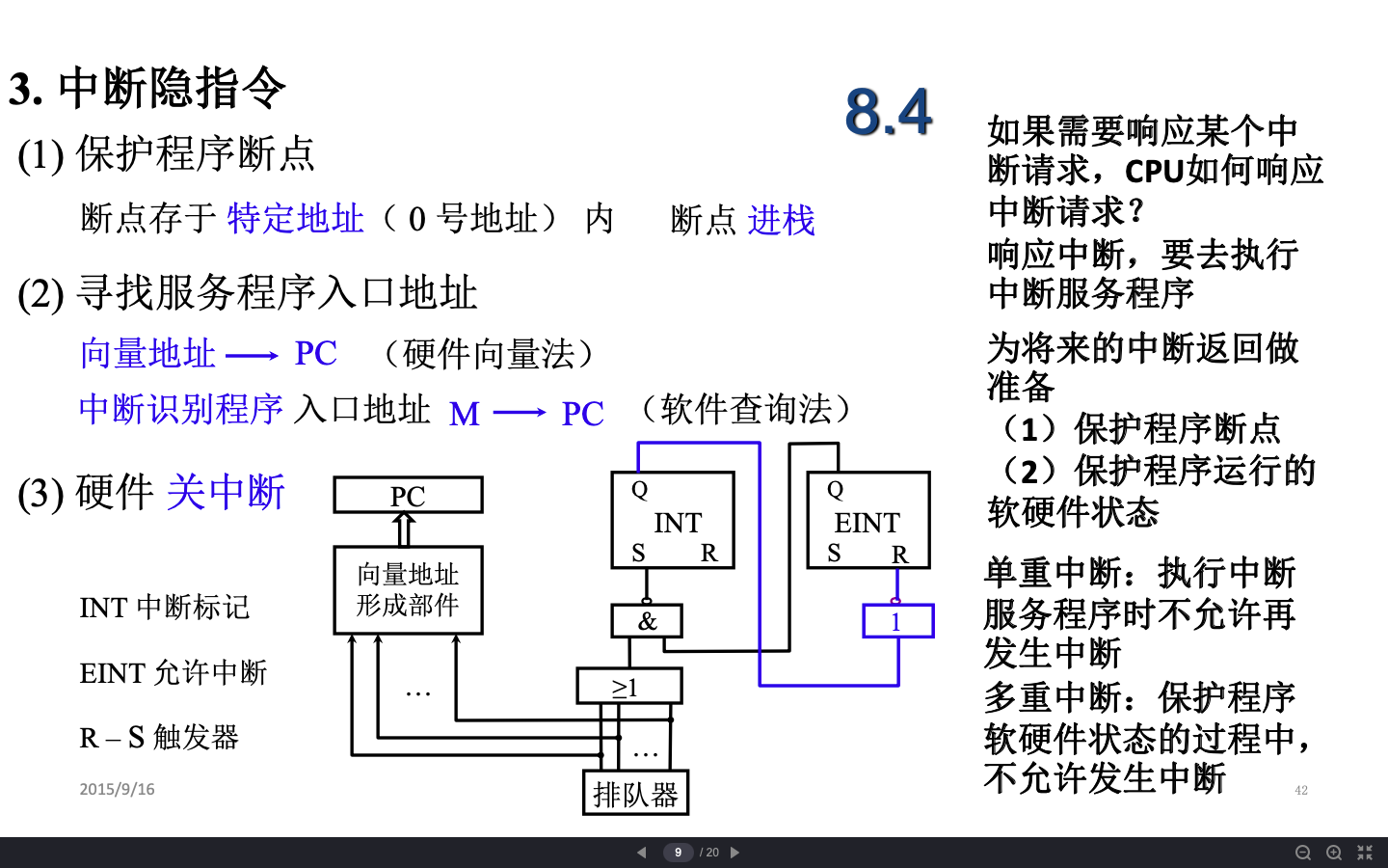 中断响应:响应中断的条件,EINT置1,响应中断的时间,执行周期结束后,CPU发查询信号;