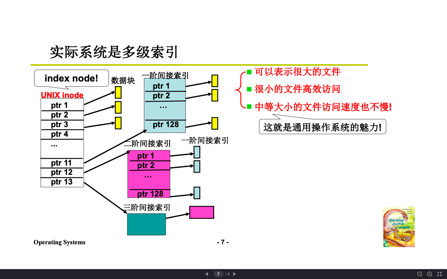 在实际中使用的是多级索引结构,操作系统维护了一些数据结构。inode (index inode)。