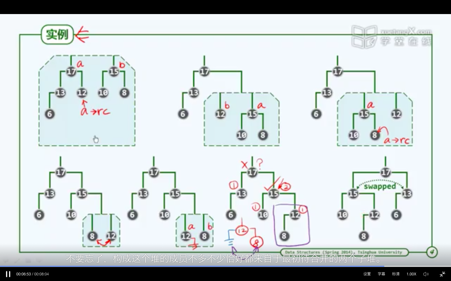 左式堆的合并算法:递归,有AB两个堆,将A的右子堆取出与B合并,合并的结果继续作为A的右子堆,在合并返回之后,比较npl值,调整位置。整个过程依据右侧链进行,O(logn)。