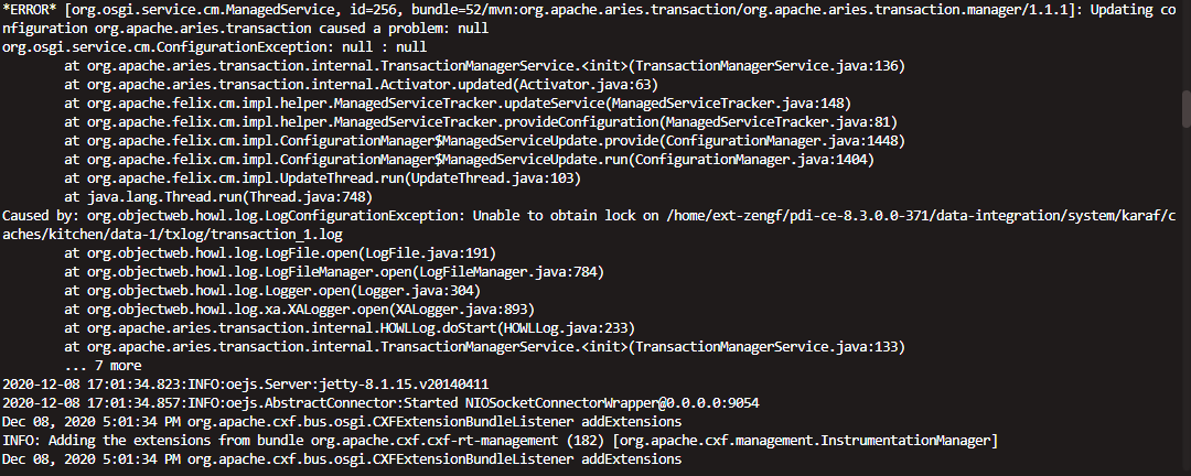 *ERROR* [org.osgi.service.cm.ManagedService, id=256, bundle=52/mvn:org.apache.aries.transaction/org.apache.aries.transaction.manager/1.1.1]: Updating configuration org.apache.aries.transaction caused a problem: null