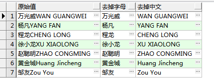 SELECT t.name 原始值 , **regexp_replace**(t.name,'[A-Za-z]') 去掉字母 ,regexp_replace( t.name,'[' || unistr('\4e00') || '-' || unistr('\9fa5') || ']') 去掉中文 FROM prl_part_plan_ins_ext t where t.contract_id = 55003104 ;