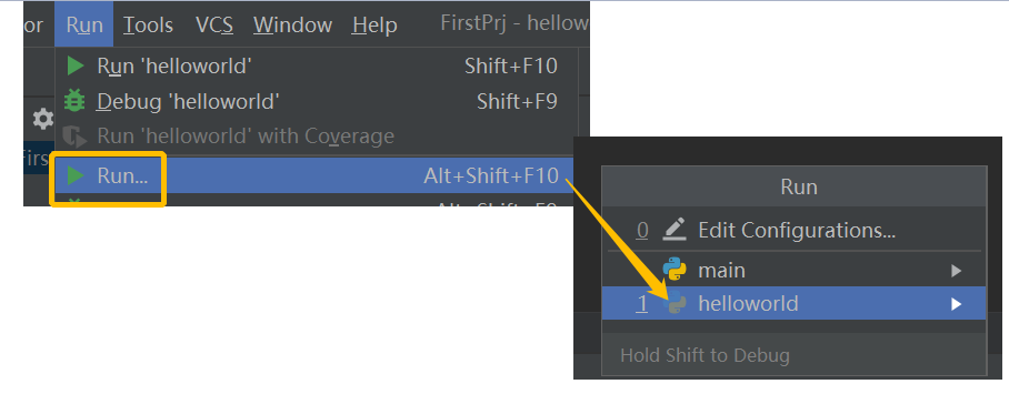 New Project,在project name点击右键new-- python file(文件名:helloworld),输入测试脚本print('hello world')