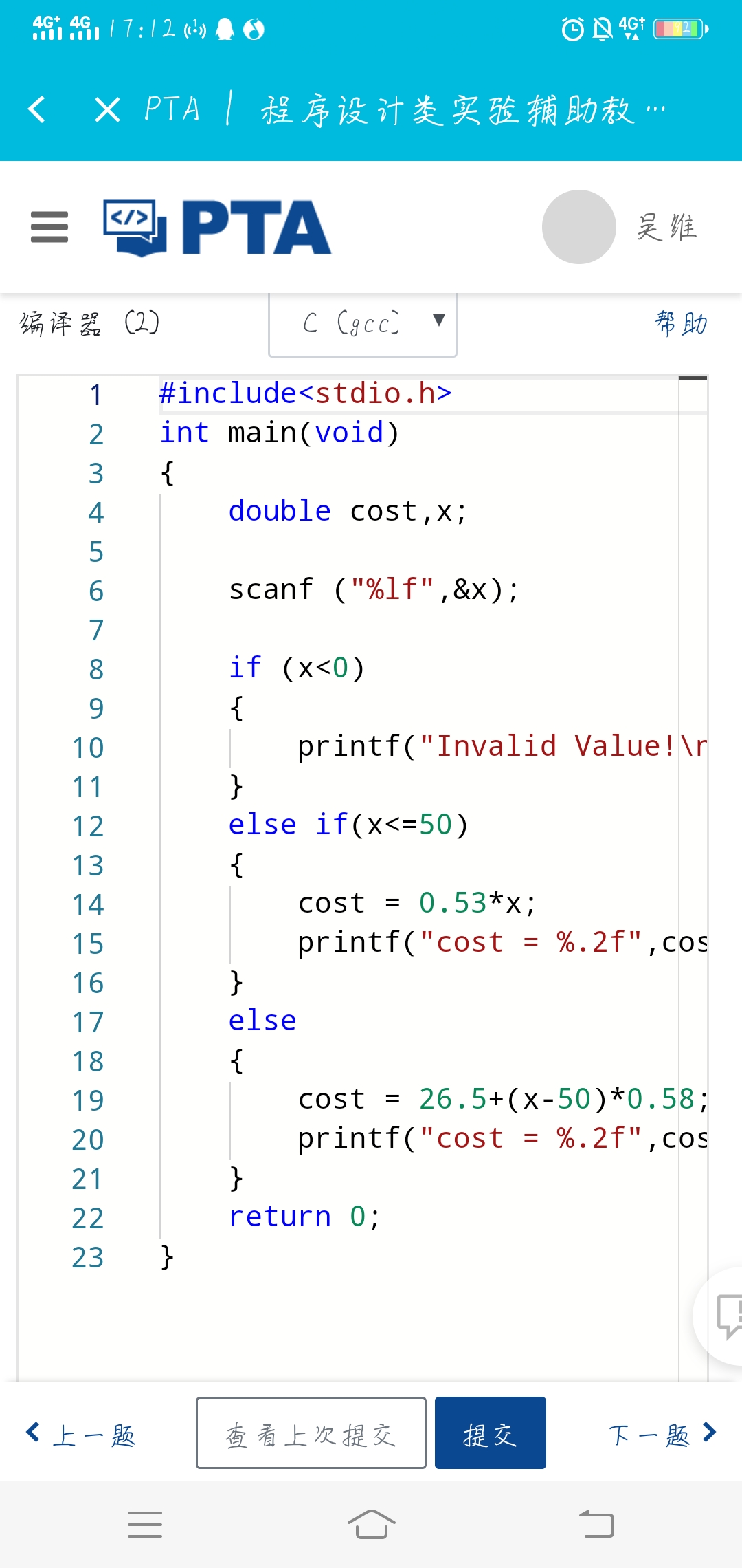 在一行中输出该用户应支付的电费(元),结果保留两位小数,格式如:“cost = 应付电费值”;若用电量小于0,则输出"Invalid Value!"