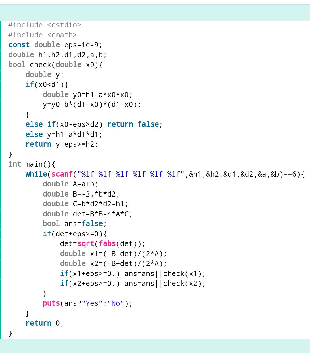 题目:原型是一个3D游戏,它允许你控制一个叫Alex的人,这个人有超能力完成任务。亚历克斯有在空中滑翔的能力。更重要的是,他最多可以滑翔3级,这意味着在他落地之前,他有两次机会调整和执行另一次滑翔。我们假设每次他滑翔时,他的垂直速度变为零,然后以新的速度向前滑翔。由于重力,轨道是抛物线。为了使问题更简单,我们现在最多只考虑2级滑翔。第一次滑翔的数学方程的二项式系数为-a,第二次滑翔的二项式系数为-b,即(y - y0) = -ax2, (y - y0) = -b(x - x0)2。如上图所示,Alex从1号楼顶部滑翔,滑翔1层或2层,正好降落在b点。更重要的是,在1号楼和b点之间有一座2号楼。输入不超过15个箱子。继续操作,直到文件结束。每个案例只包含一行六个实数,h1, h2, d1, d2, a, B。h1是建筑物的高度,h2是建筑物的高度,d1是建筑物1和建筑物2之间的x距离,d2是点B和建筑物1之间的x距离。这四个数在[0,1000]中,并且满足d1 < d2。a和b在(0,1000)中。输出,如果Alex可以准确降落在B点,打印Yes,否则打印No。在第二种情况下,亚历克斯只是滑过建筑物,而不是撞在上面。
