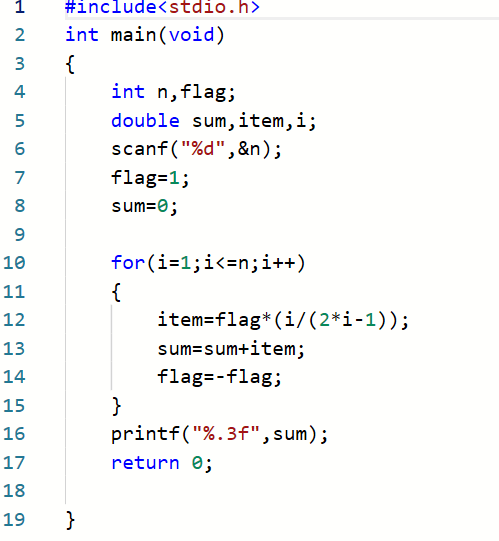 数据表达:用了i,N,denominator,flag,属于整型变量;还使用了sum,item,属于双精度浮点型变量;