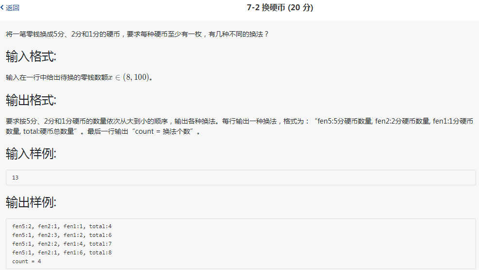 | 13 | fen5:2, fen2:1, fen1:1, total:4;fen5:1, fen2:3, fen1:2, total:6;fen5:1, fen2:2, fen1:4, total:7;fen5:1, fen2:1, fen1:6, total:8;count = 4 | 验证题目所给数据 |