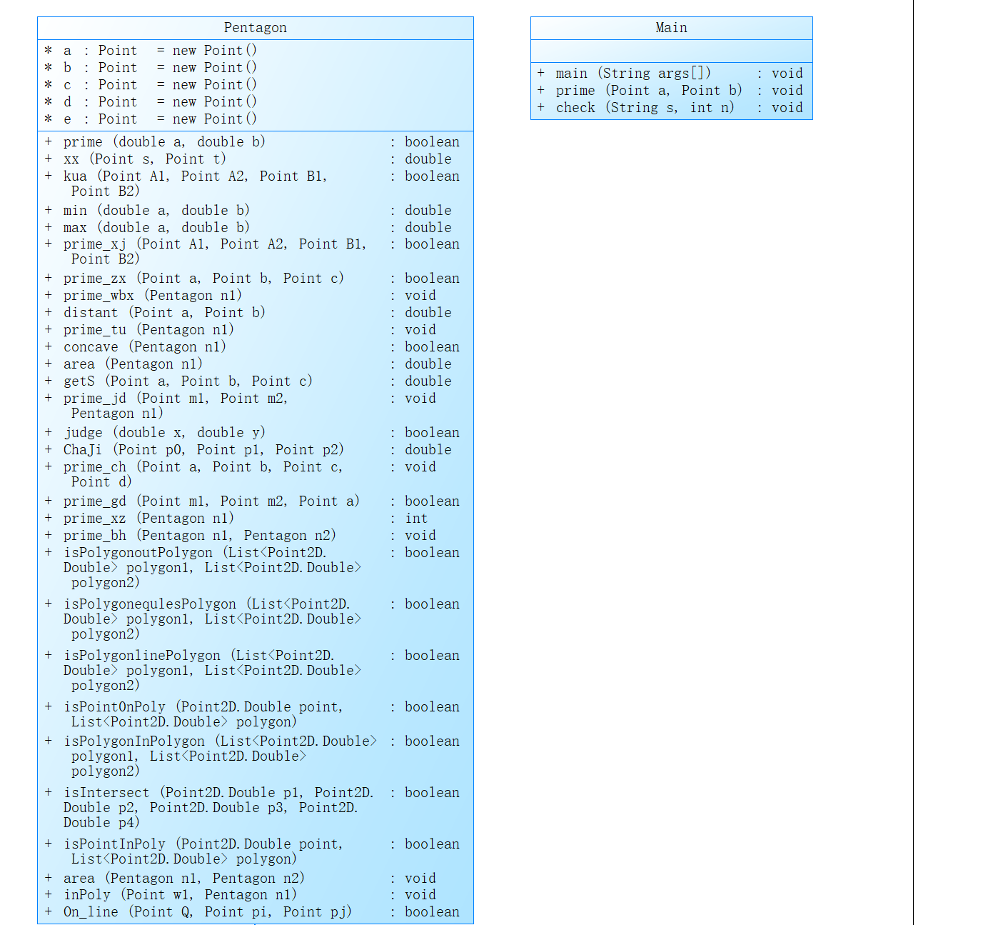 最开始仍是对输入的字符串进行格式的判断并存储点坐标。判断五边形我用的是连续三点没有形成直线并且对应直线不相交。判断凹凸性我借鉴的网上的方法利用叉乘。周长面积我用了相应的数学方法。第三点判断交点并计算相应的面积的方法我还是没想到,唉,只能等着老师教相应的方法了。判断包含关系,我运用的图像Path类方面的特性与方法,非常好用!第五点跟第三点类似,这种面积的,我都不会...第五点利用第四点中的相关方法特别简单。