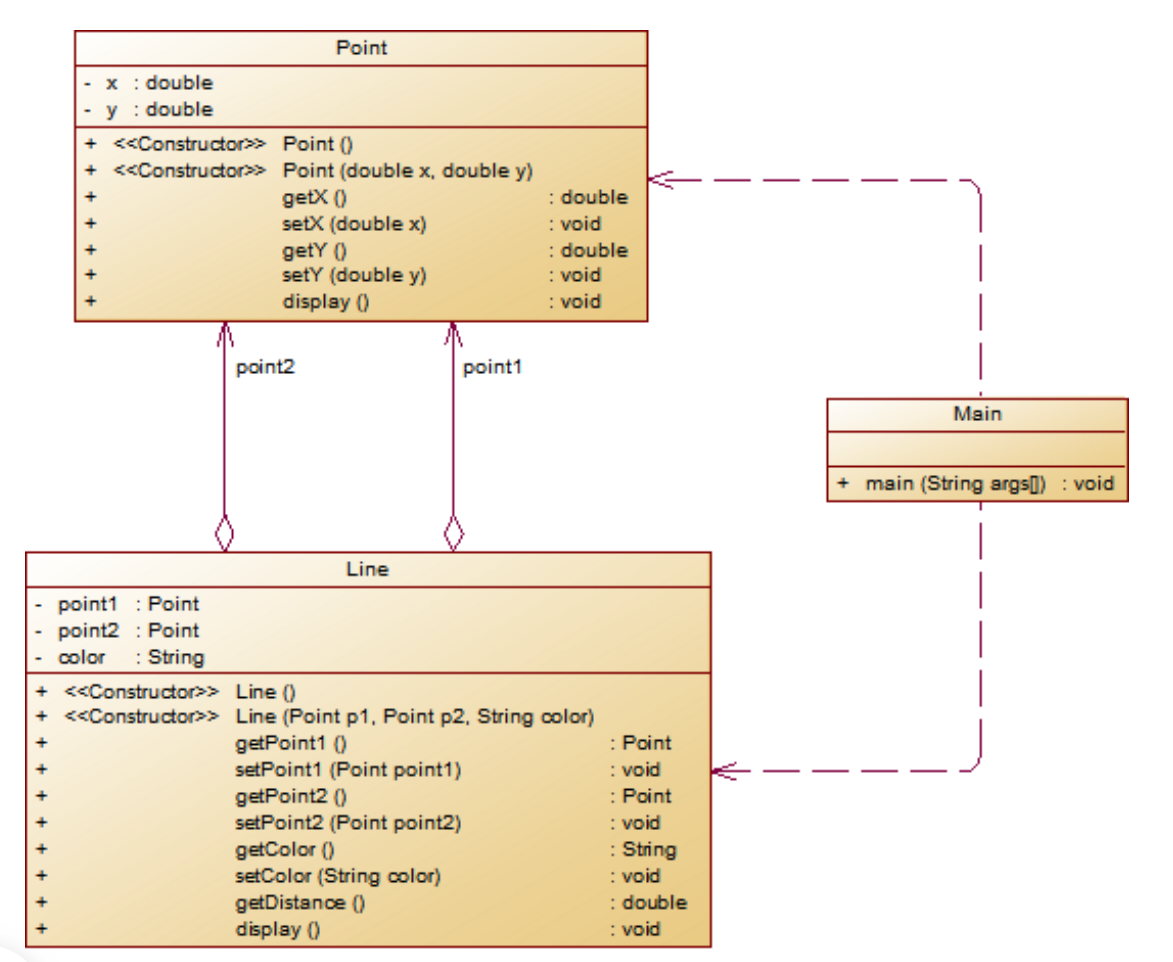 import java.util.Scanner; public class Main { public static void main(String[] args) { Scanner in = new Scanner(System.in); double x=in.nextDouble(); double y=in.nextDouble(); double x2=in.nextDouble(); double y2=in.nextDouble(); String color=in.next(); Point p1=new Point(x,y); Point p2=new Point(x2,y2); Line line =new Line(p1,p2,color); Plane plane=new Plane(color); Element element =new Element(); element = p1;//起点Point element.display(); element = p2;//终点Point element.display(); element = line;//线段 element.display(); element = plane;//面 element.display(); } public static class Element { public void display() { } } public static class Line extends Element { private Point point1=new Point(); private Point point2=new Point(); private String color ; public Line() { } public Line(Point p1,Point p2,String color) { setPoint1(p1); setPoint2(p2); setColor(color); } public Point getPoint1() { return point1; } public void setPoint1(Point point1) { this.point1=point1; } public Point getPoint2() { return point2; } public void setPoint2(Point point2) { this.point2=point2; } public String getColor() { return color; } public void setColor(String color) { this.color=color; } public double getDistance() { double dis=0; double m=Math.pow(point1.getX()-point2.getX(),2.0)+Math.pow(point1.getY()-point2.getY(),2.0); dis=Math.pow(m, 0.5); return dis; } public void display() { System.out.println("The line's color is:"+getColor()); System.out.println("The line's begin point's Coordinate is:"); point1.display(); System.out.println("The line's end point's Coordinate is:"); point2.display(); System.out.print("The line's length is:"); System.out.println(String.format("%.2f",getDistance())); } } public static class Point extends Element { private double x; private double y; public Point() { } public Point(double x,double y) { setX(x); setY(y); this.y=y; } public double getX() { return x; } public void setX(double x) { if(x<=200&&x>0) { this.x=x; } else { System.out.print("Wrong Format"); System.exit(0); } } public double getY() { return y; } public void setY(double y) { if(y<=200&&y>0) { this.y=y; } else { System.out.print("Wrong Format"); System.exit(0); } } public void display() { System.out.println(String.format("(%.2f,%.2f)", x,y)); } } public static class Plane extends Element{ private String color; public Plane(String color) { setColor(color); } public String getColor() { return color; } public void setColor(String color) { this.color=color; } public void display() { System.out.println("The Plane's color is:"+color); } } }