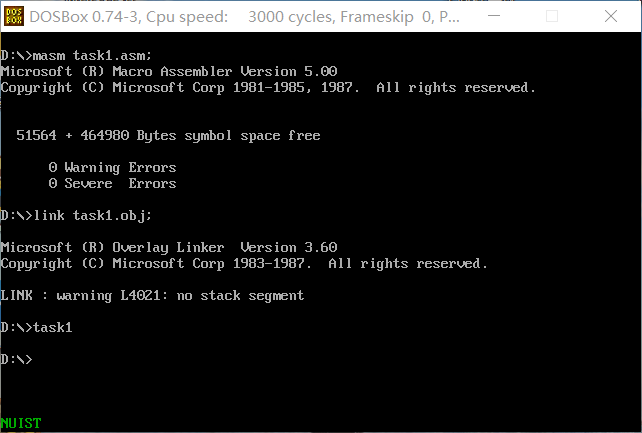 mov cx, 5 //设置循环次数为5次(Nuist有5个字节) mov si, 0 //设置偏移量,这是设置数据段ds的偏移地址 mov di, 0f00h //设置es的偏移地址 s: mov al, [si] //将ds:[si]一个字节的内容存入al and al, 0dfh //将字母大写 mov es:[di], al //将al里的数据存入附加段里面去,这里存入的是数据信息 mov al, [5+si] //将ds:[5+si]存入al mov es:[di+1], al //再次存入到附加段里面去,这次是存在高位上面,是颜色信息 inc si //si自加 add di, 2 //附加段的偏移地址加2,移动一个字的单位 loop s //循环