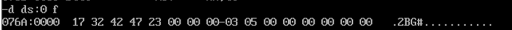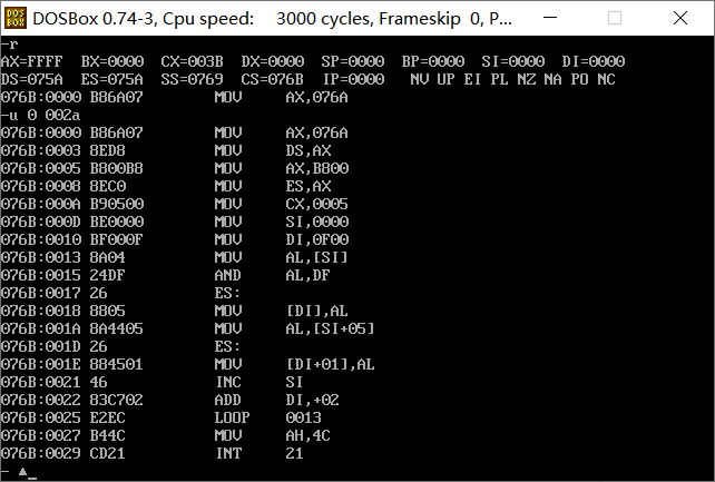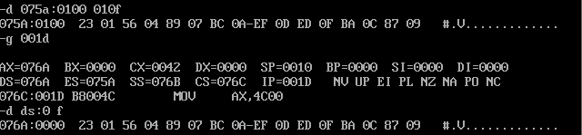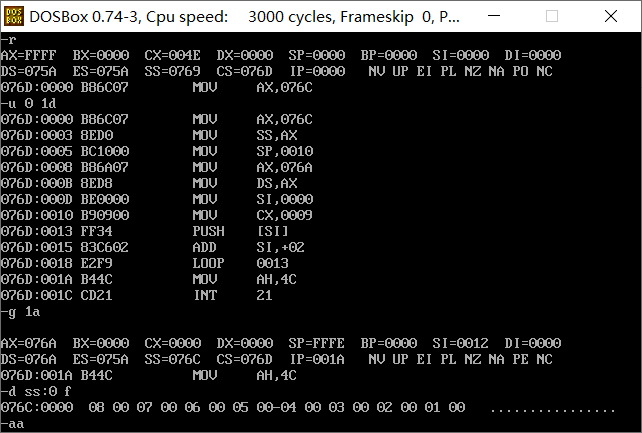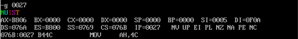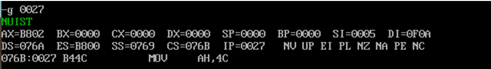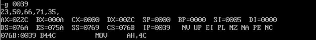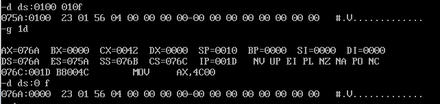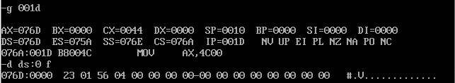 反汇编后得知程序在 001ah处返回,使用 -g 001a命令