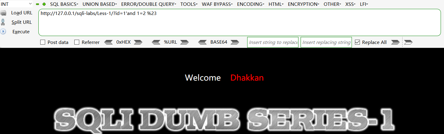 输入?id=1'--+,显示报错,继续输入?id=1')--+页面仍然报错, 多次尝试1' 1" 1') 1") 1')) 最后发现是1')),页面显示正常了。