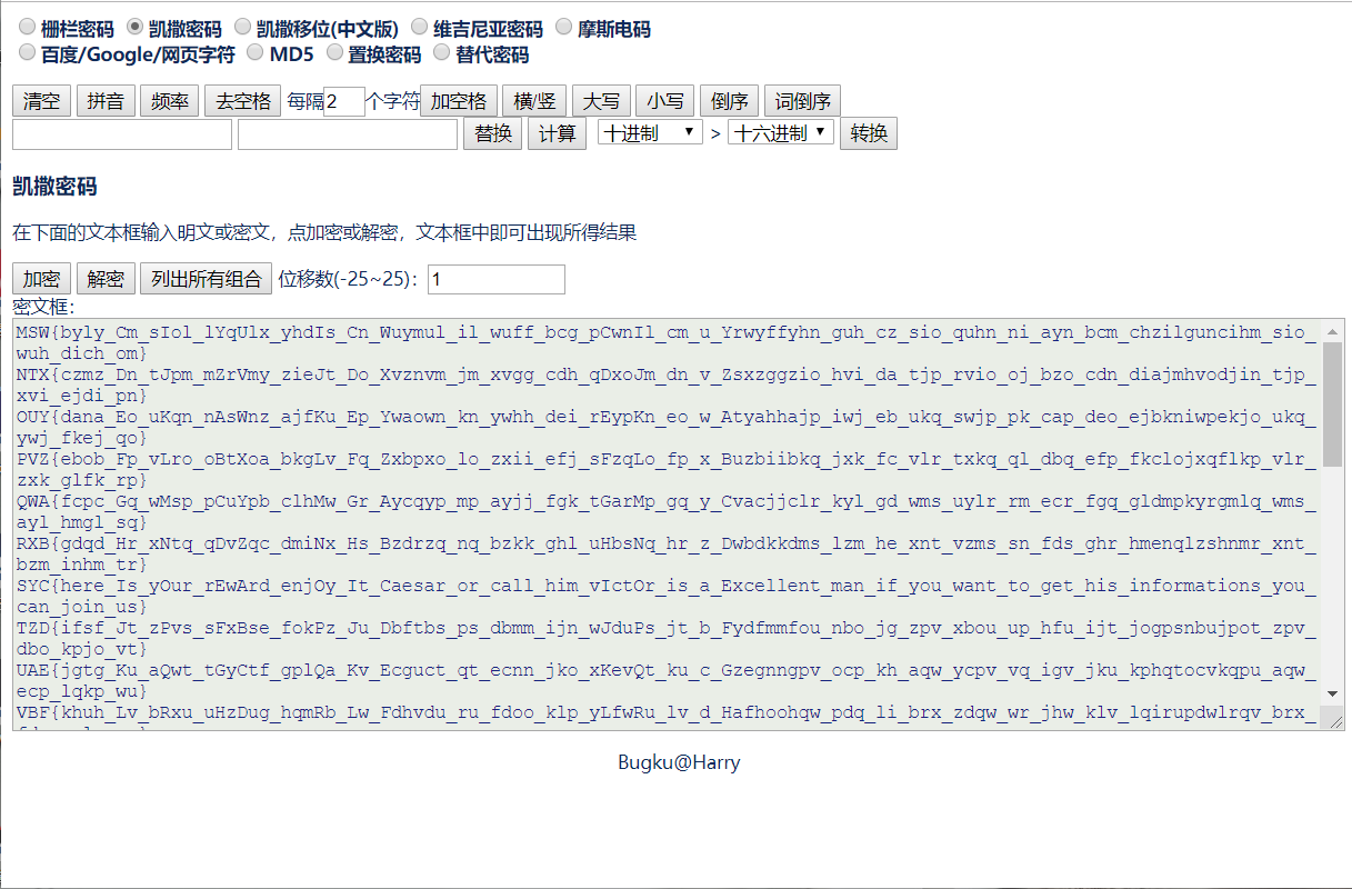 看着挺凶的题,拿去解个密竟然就出来了;这里使用的是Bugku的工具,不得不说,真的很好用,嘿嘿。