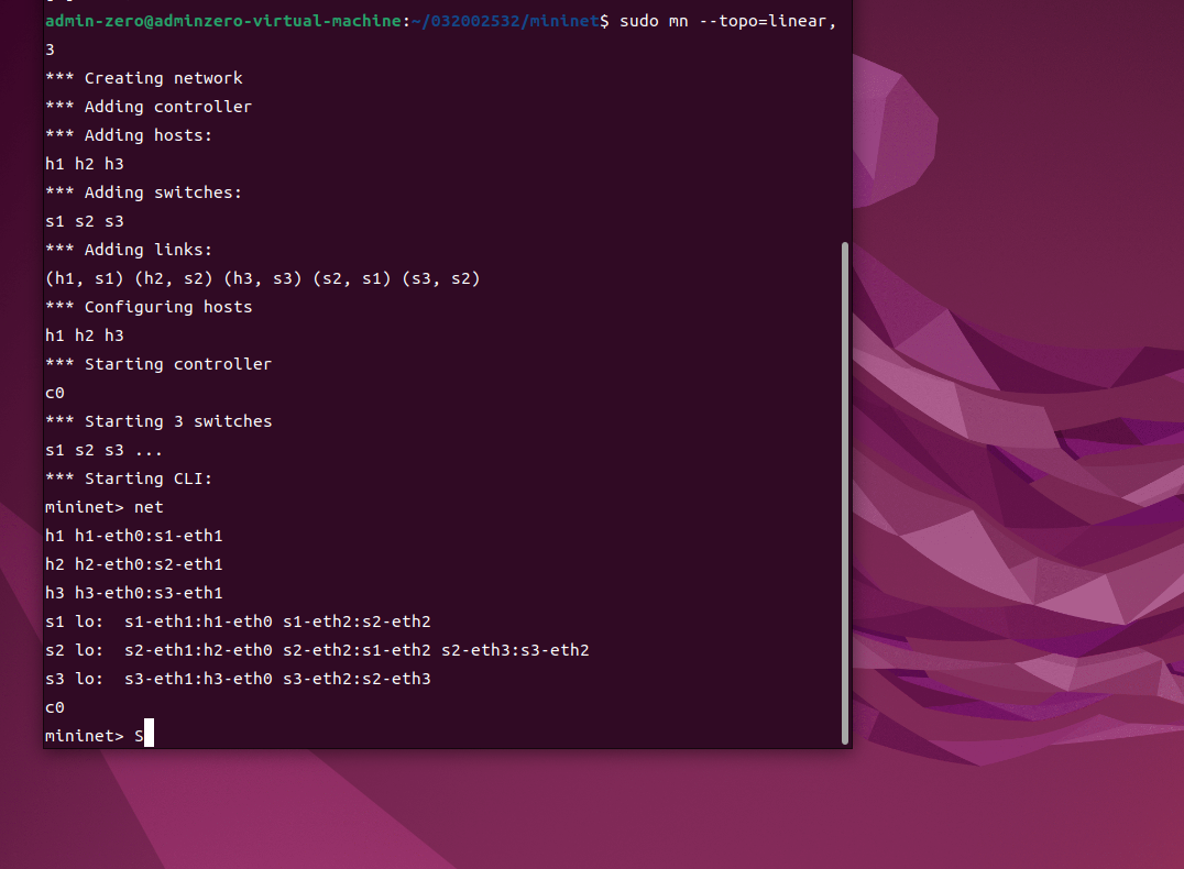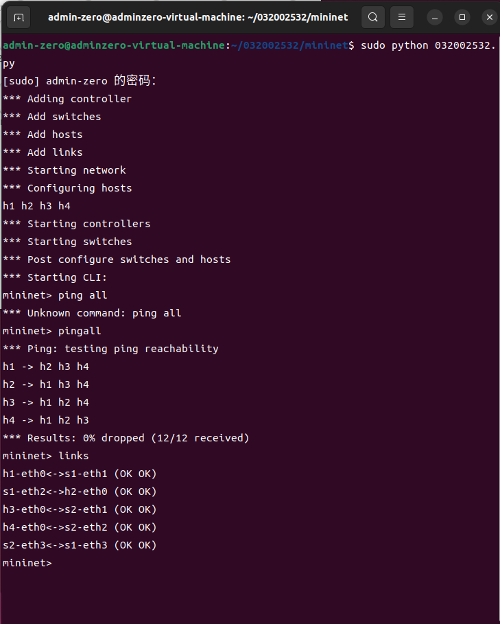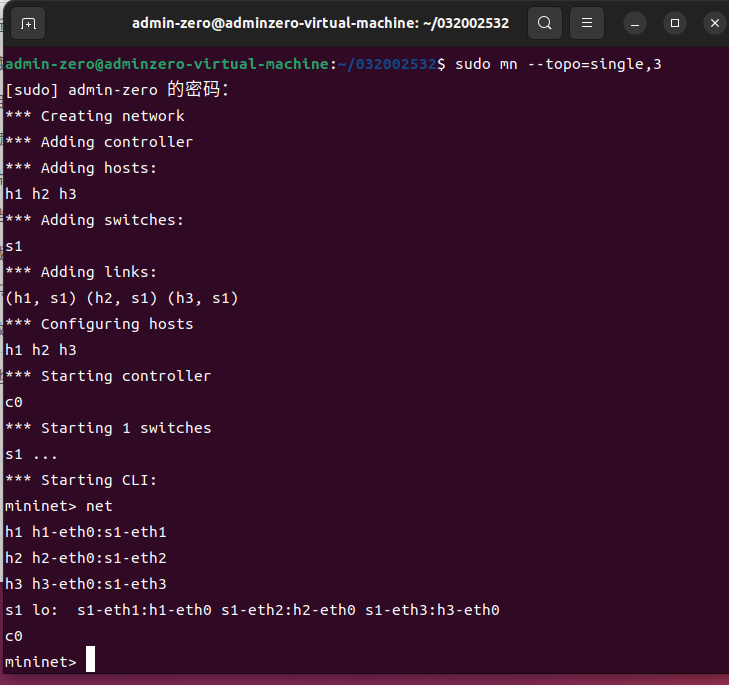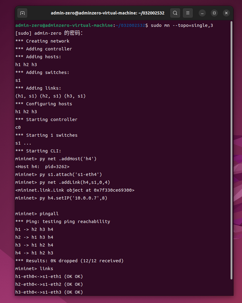 在2 b)的基础上,在Mininet交互界面上新增1台主机并且连接到交换机上,再测试新拓扑的连通性。