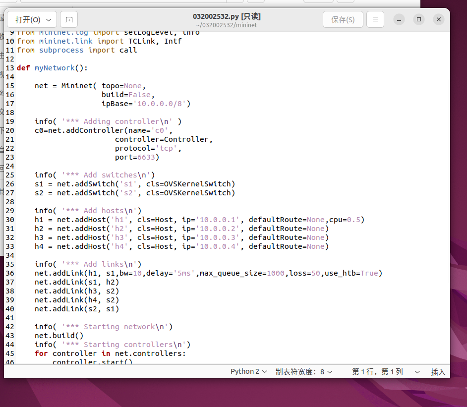使用Mininet可视化工具,生成下图所示的拓扑,并保存拓扑文件名为学号.py。