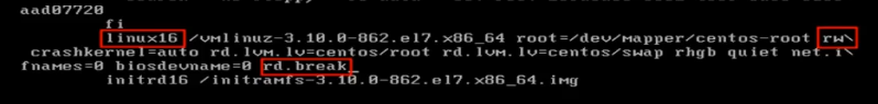 进入Linux界面 在linux16那一行把 ro 改成rw 并且在最后一行增加rd.break 之后按ctrl+x 显示switch_root#: